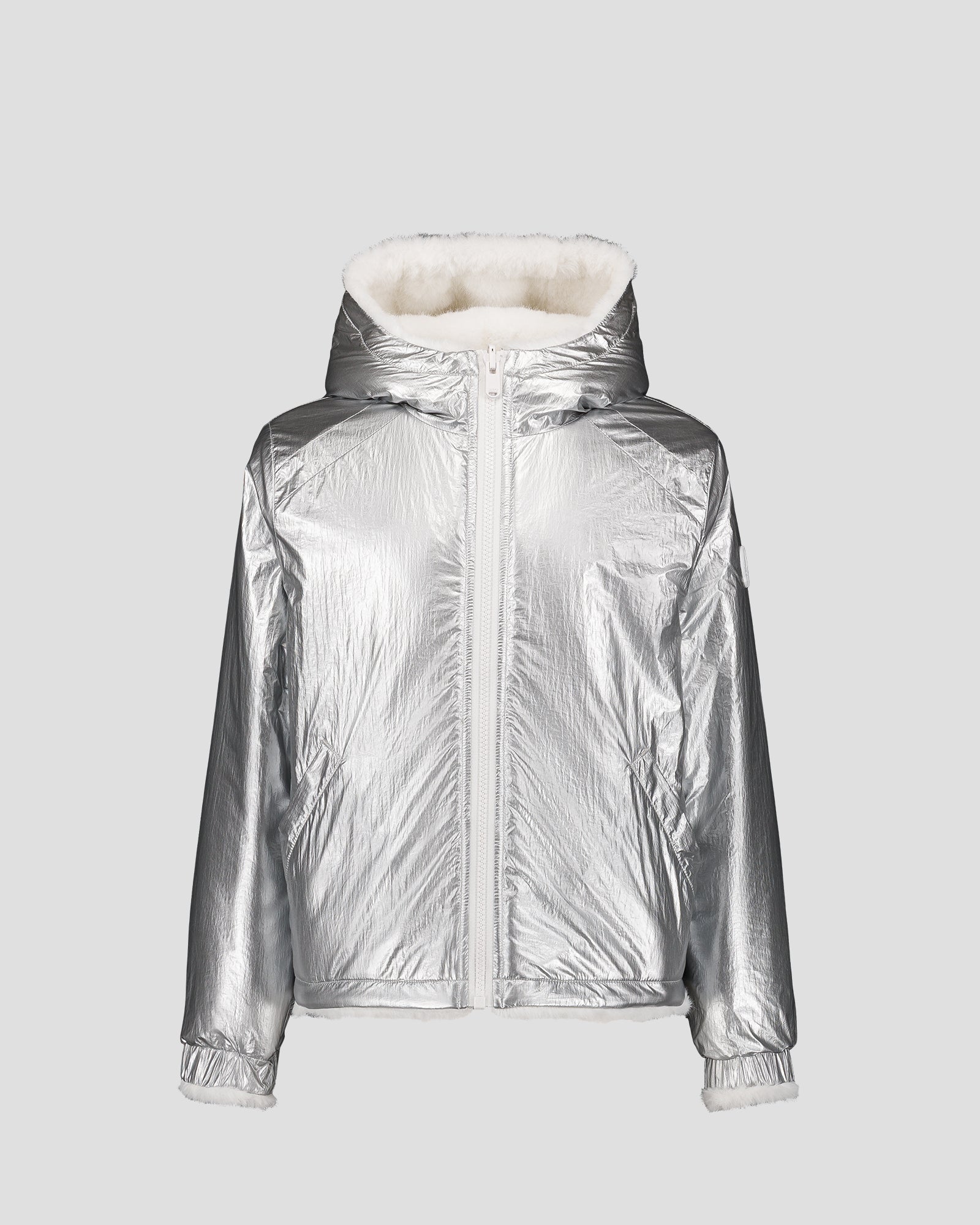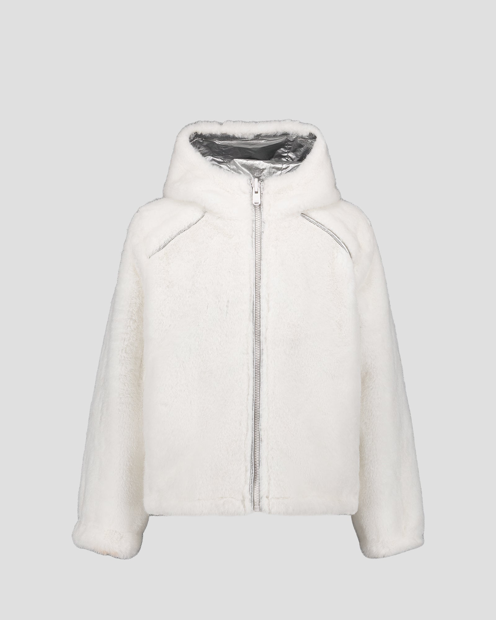 - Capuche en tissu métallisé doublée en fausse fourrure