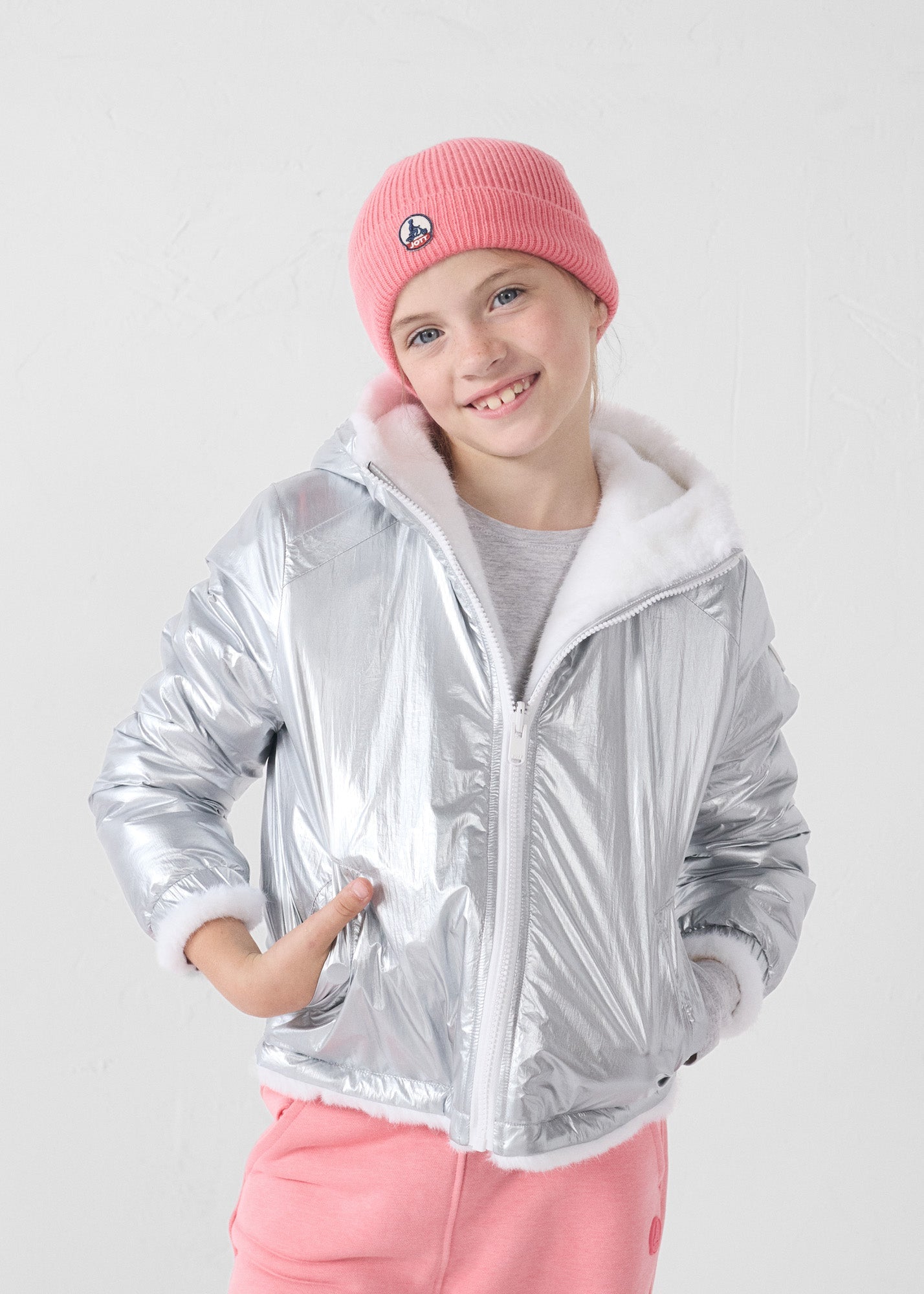 Veste réversible 2-en-1 : côté métallisé pour briller, côté fausse fourrure pour un max de douceur. Coupe confortable et détails pratiques, l’alliée stylée de l’hiver.